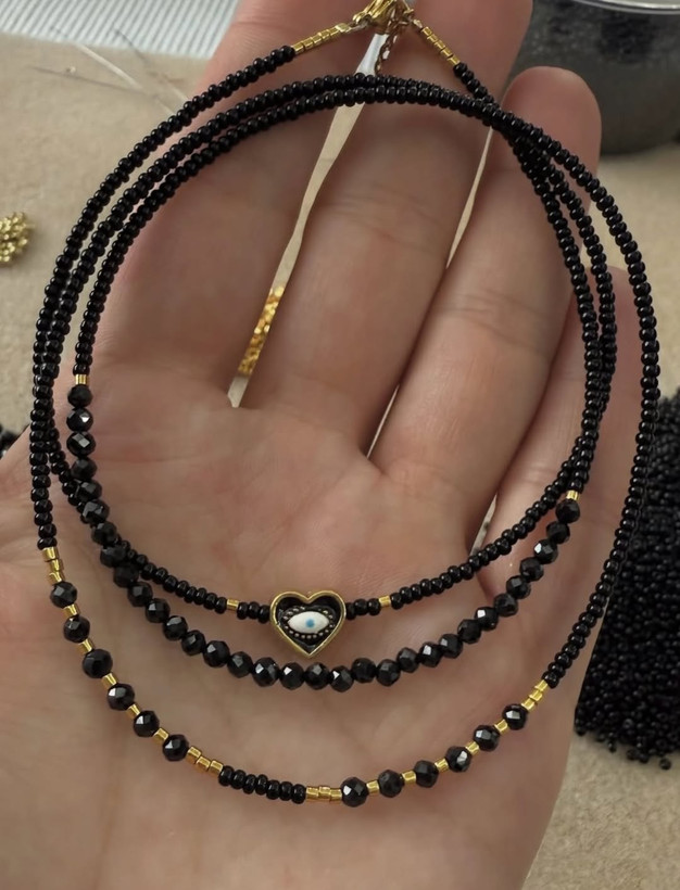 آویز قلب چشم نظر ترکیب مهره های مشکی براق با طلایی