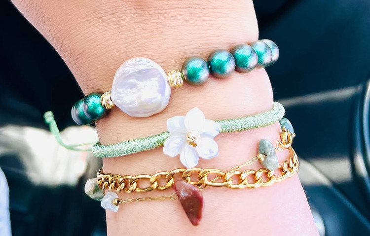 متاسفانه این کالا در حال حاضر موجود نیست. میتوانید از طریق لیست بالای صفحه، از محصولات مشابه این کالا دیدن نمایید.دستبندهای ترکیبی از طلا، گل صدفی، مروارید پرورشی و مروارید سبز سوارسکی ترکیبی منحصربهفرد برای استایلی لوکس و جذاب.